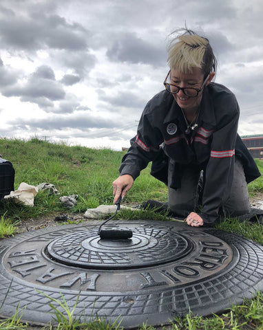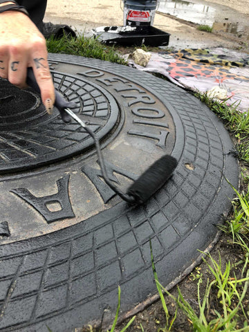 New from Well Done Goods. Hand printed in Detroit. We may not be the first to ever do this technique, but it sure is fun! You can do it too, but we've save you the mess and clean-up time, and we get some pretty strong arms. Love this bag? See all our manhole cover designs!