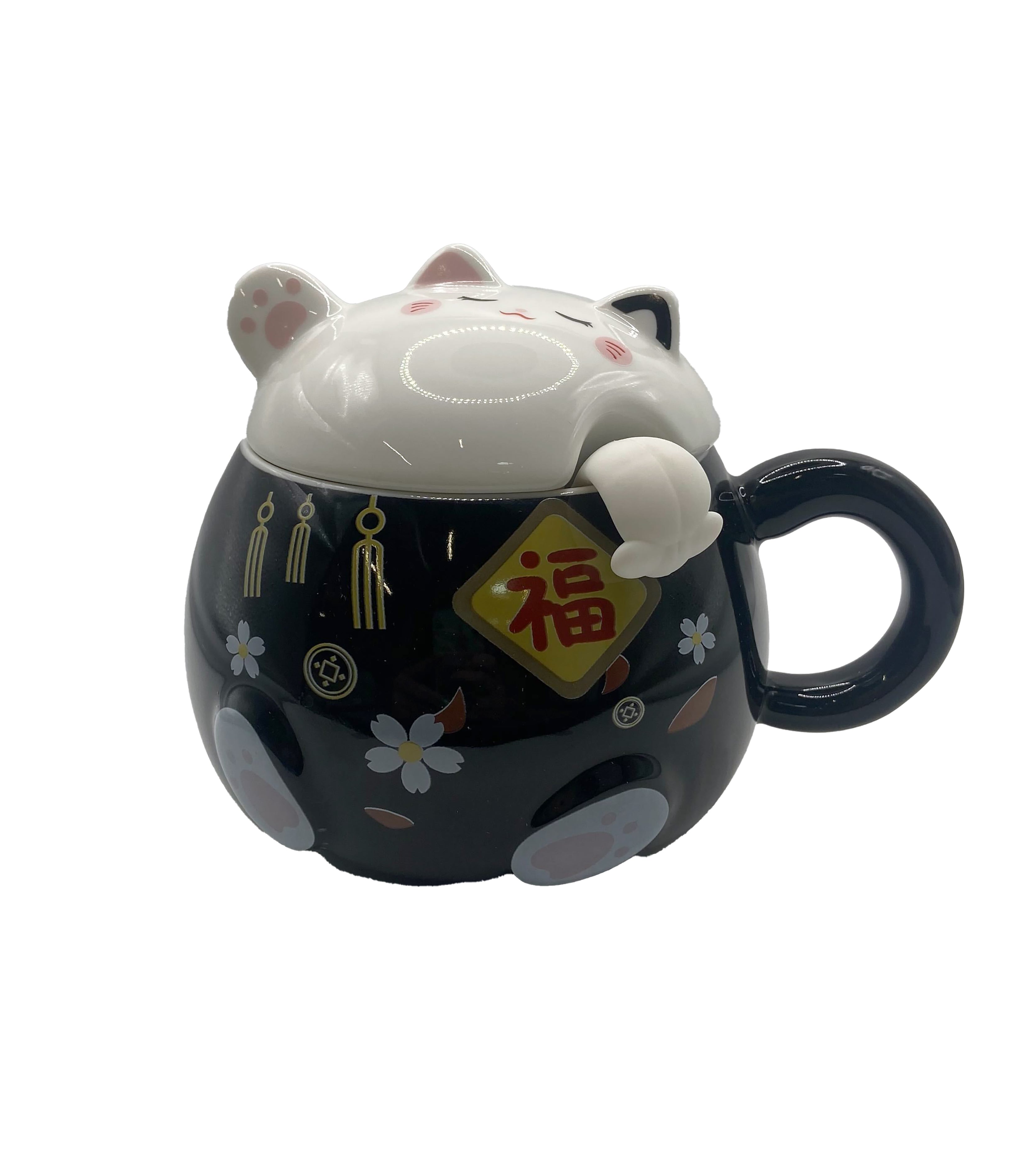 Lucky Cat Mug with Lid and Spoon. Ever brew the most prefect cup of tea, set it down, forget about it and then come back to a cold cup?! Well NO MORE! This mug not only cute but prefect for tea drinkers, painters (never drink the paint water again!), cat parents (we know they have their own water but they want YOURS) and kitty fanatics! Protect your peace and your drink!