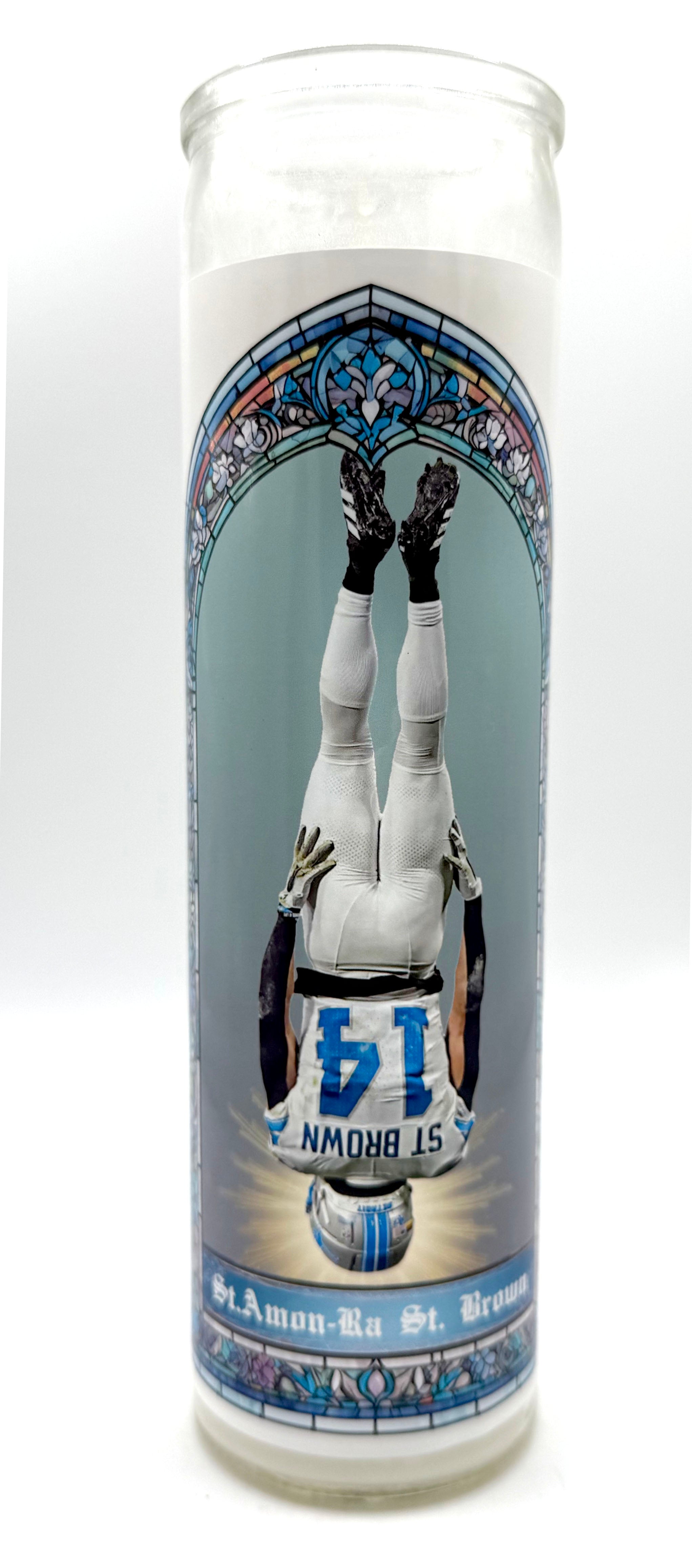 NEW Version for the 2025 season! Tall altar/ prayer candle featuring the Patron Saint of Yardage - the Lions' Amon-Ra Saint Brown! Light this up and RECEIVE the joyous win!